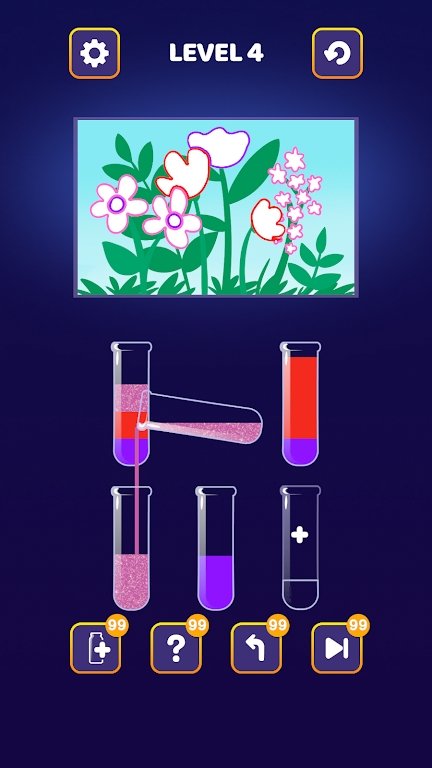 液体彩色水分类艺术游戏是一款让人放松又考验智慧的休闲益智游戏。玩家需要将不同颜色的液体倒入各种形状的玻璃容器中,通过精准的操作和策略,将各色液体完美分类,创造出缤纷多彩的艺术作品。