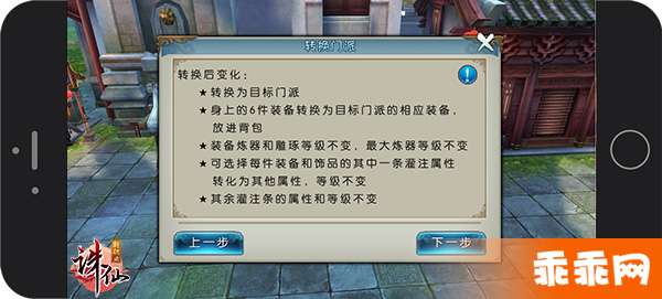 步入一个全新的门派,你的修仙之旅将出现一系列翻天覆地的变化。门派转换的同时,技能和天书将全部重置,原有门派的装备将被扣除,转换为目标门派对应部件的真仙/散仙/上品装备,将放进你的背包中。在这个过程中,装备的炼器等级不变,最大炼器等级不变,装备的雕琢等级也不会改变。灌注方面,仙友们在转职后可选择每件装备和饰品的其中一条,转化为别的属性,而灌注等级也将不变。与此同时,转职前的饰品和宝石也将保持不变状态。