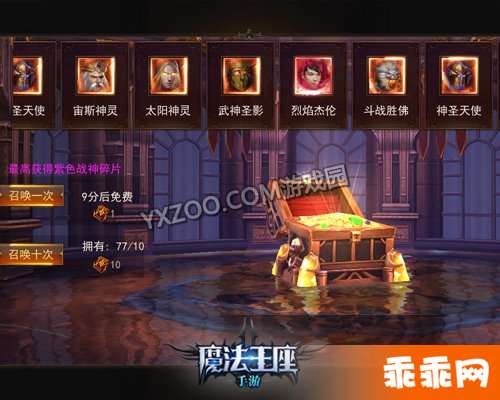 在戏园戏中,点击主界面上方的“召唤”按钮即可快速进入战神殿。此时,所有最强大的战神英灵们会在上方依次出现。