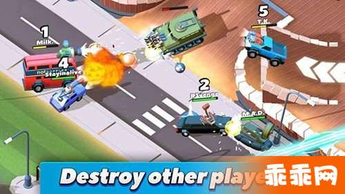 这是一款支持多人实时在线的游戏,在这里你的游戏目的就是“撞车”,去撞击破坏其他玩家的车,并夺走他们的王冠,取得全场王冠最多者则能成为胜利者。你以为各种乱撞就够了?当然不是,这款游戏与其说是撞车不如说是大乱斗,你要注意拾取场景中的各类道具,合理使用他们就可以帮助你及时加速、投掷障碍或发射子弹等,而这些道具都是随机,各种不确定性将让你感受像好莱坞电影《死亡飞车》那样的刺激冒险。