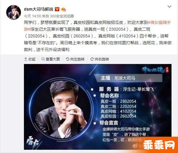 大司马是一位游戏主播,但他以犀利的操作和诙谐幽默的语言,俘获了几百万粉丝。上周六,当他在梦岛发了建班级做摸底考消息之后,立刻成为梦岛全服热点,蝉联数日第一,大家搜索下他的名字就能了解始末。其实,早在上周五,马老师就发了微博要收徒弟,选班花,玩“摸底考”(帮会宣战)。消息一经发布,无数水友表示要当班花,甚至晒出了自己的美丽自拍!海量水友涌入倩女幽魂手游三界,争相加入马老师的班级。