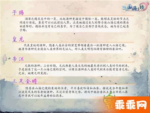 游戏的主角是主人公和灵歌,而他们将在整个山海之境中游历,遇到各种各样的角色。这其中有为了通过修行而必须打倒的四灵;也有在各处闹事,破坏山海之境和谐的四凶;有些角色会给主人公提供帮助或者成为共同的队友;当然也有些角色会沦落为灵歌“登天”的垫(jing)脚(yan)石(zhi)。