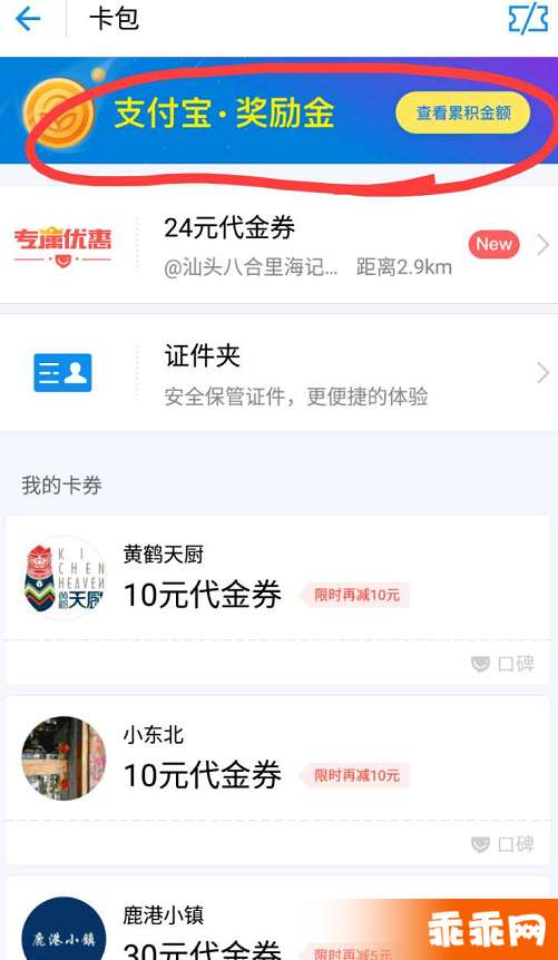 打开支付宝软件,点击首页的【卡包】,进入后就可以看到顶部的【支付宝奖励金】活动,点击后就可以看到累计金额。