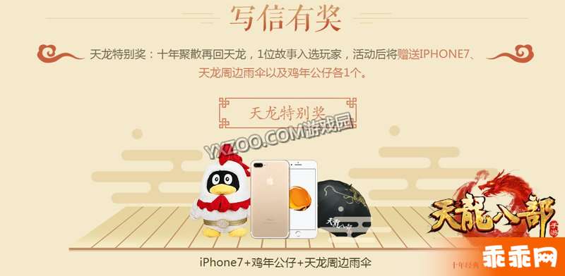 读罢赵天师的来信,是否也该提笔进行回复?《天龙八部手戏园》写信有奖活动全面开启。即日起至4月11日活动期间,玩家可给赵天师写信,讲述关于自己的天龙故事。戏园戏将力邀知名CV倾情演绎玩家投稿来信,情感真挚的玩家故事还有机会被拍成短剧。除此之外,在信件征集活动结束后,戏园戏还将从众多投稿来信中评选出“最具人气故事奖”、“最感动故事奖”、“最具文采故事奖”,以及终极大奖“天龙特别奖”,可获得包括iPhone7、京东卡或等价值物品、鸡年公仔、天龙周边雨伞等丰厚奖励。