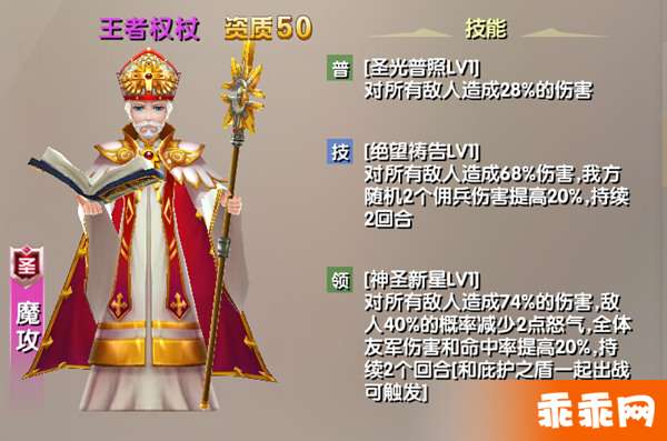 合体技能:[神圣新星LV1] 对所有敌人造成68%的伤害,敌人40%的概率减少2点怒气,全体友军伤害和命中率提高20%,持续2个回合