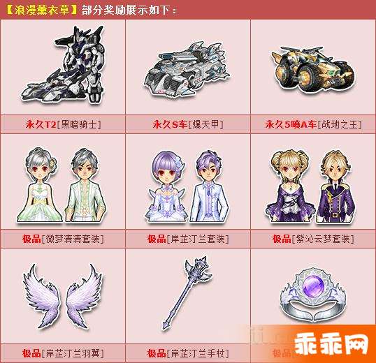 【浪漫薰衣草】,3月21日-4月30日限时出售!开启100%获得:角色经验卡+900,且有机会获得:永久T2【黑暗骑士】、永久S车【爆天甲】、永久5喷A车【战地之王】、极品【微梦清清套装】/【岸芷汀兰套装】/【紫沁云梦套装】或其他奖励之一!