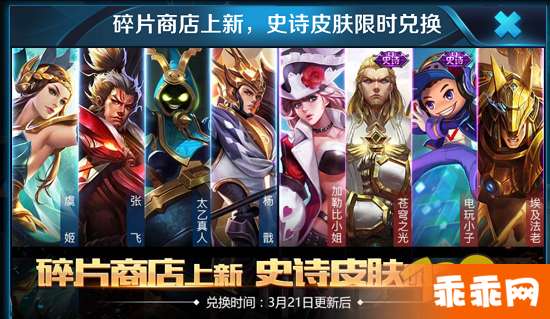 皮肤碎片商店更新为:电玩小子,苍穹之光,加勒比小姐,埃及法老,激情绿荫,隐刃,异域舞娘,三太子,维京掠夺者,精灵公主,西部大镖客,白色死神,未来纪元,幽灵船长,乱世虎臣,黄金武士, 大发明家,金属风暴,死亡骑士,魅力维加斯