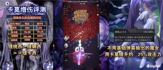 从图上就能清晰看出,卡莫能力对于基础弹幕输出不行的魔女提升真的非常小,缇莉雅因为被封印了四星能力,主要就靠大招输出了,结果卡莫就因此:连娜塔莉亚都能把卡莫秒成渣渣,那卡莫目前真的一无是处吗?卡莫如果辅助基础弹幕输出强势角色又会如何呢?