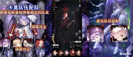 由上面的测评我们也能了解到:卡莫需要搭配基础弹幕输出的魔女比如:桃乐丝、夏洛特、玛丽、尤斯蒂缇。其中桃乐丝的提升是最大的,另外三个魔女星图也是于本版本刚刚开放,强度还有待考证。所以卡莫目前队伍配队只推荐:卡莫、西格莉德、桃乐丝。
