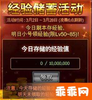 小号领经验是有要求的,限50-85级哦,士在当天内通关地下城所获得的经验将会按照一定比例储存起来,最多可以储存1千万经验值,在第二天登陆游戏之后即可领取,小号升级福利。