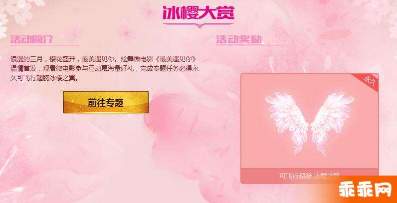 炫舞微电影《最美遇见你》温情首发,观看微电影参与互动赢海量好礼,完成专题任务必得永久可飞行翅膀冰樱之翼。目前活动尚未开启,大家期待一下吧。浪漫的三月,樱花盛开,最美遇见你。