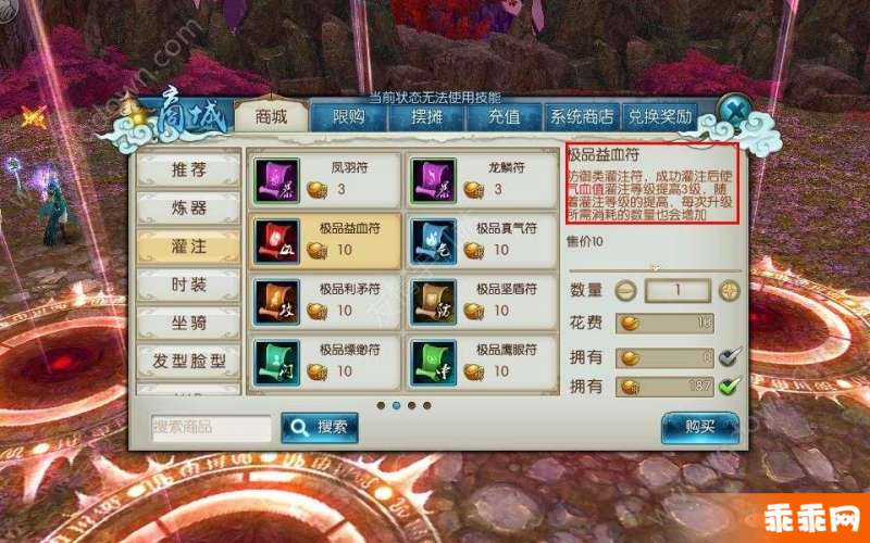 灌注符可以在商城购买还有一些副本也都会有掉落,灌注符也是五花八门在这里个人的心得是主打 攻(利矛符) 血(益气符) 防(坚盾符)这三类用来灌注,这类相对来说也是最尤为实用的。其他的灌注符基本前期可以先无视掉。