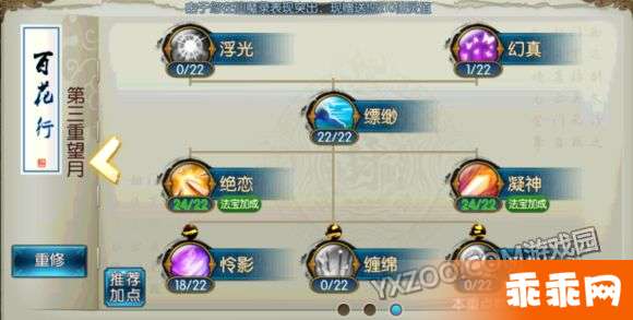 第三重——浮光1 幻真1 飘渺22 绝恋18 凝神19 缠绵18 共计81点