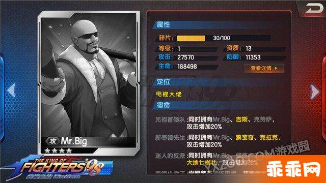 Mr.Big资质为13资质,这让诸多玩家感到不解,毕竟其包含宿命“元祖首领队”,但细细考究,Mr.Big在拳皇游戏中存在感并不高,并非是一位人气与实力并存首领,因此很难给其一个更高资质的定位。