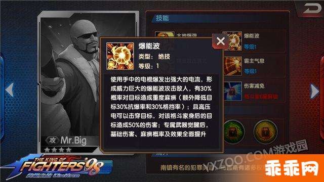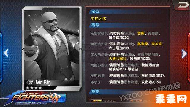 下面要给大家介绍的就是关于拳皇98终极之战ol中对于Mr.Big的技能解析了,想要知道Mr.Big的技能有哪些以及宿命如何那就跟随小编过来看看吧,希望以下内容能够帮助大家更好的体验游戏。