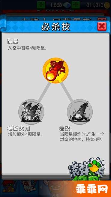 升级必杀B:岩浆,当陨星爆炸时,产生一个燃烧的地面,持续6秒。