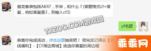 题目:御龙套装包括AK47,手斧,和什么?(答题格式cf+答案,例如答案是3,则输入cf3)每日一题答题福利继续为大 家 送上, 快来领取微信每天送上的免费抽奖活动奖励吧!