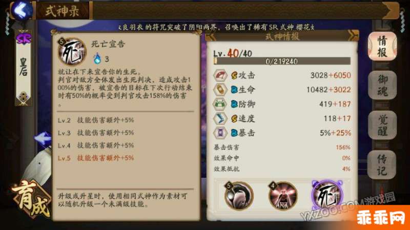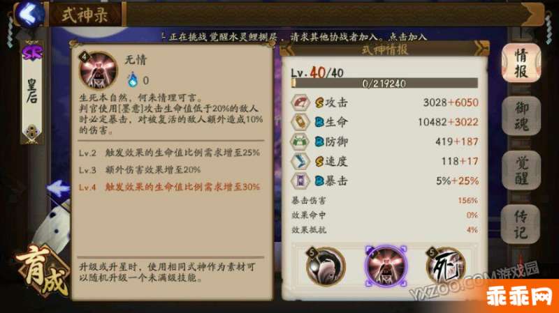 无情,对生命值低于20%的目标造成100%暴击,对复活的敌人造成额外10%的伤害,满级为生命值的30%,额外伤害20%,这是针对于残血类型的式神的收割和克制复活流的技能