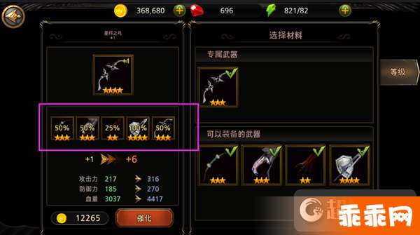 点击强化后,专属武器就会吞噬掉下放武器,按照概率提升专属武器等级。