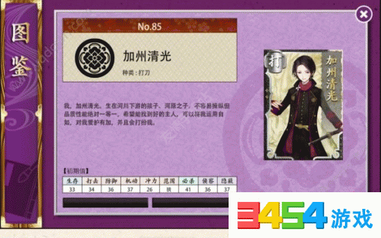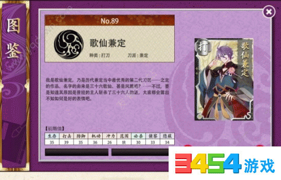 歌仙兼定:生存:35;打击:39;防御:35;机动:36;冲力:26;范围:狭;必杀:30;侦察:33;隐蔽:34