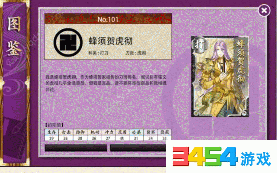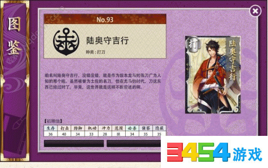 陆奥守吉行:生存:36;打击:40;防御:34;机动:33;冲力:28;范围:狭;必杀:34;侦察:35;隐蔽:35