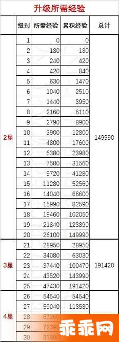 1-30级升级需要经验