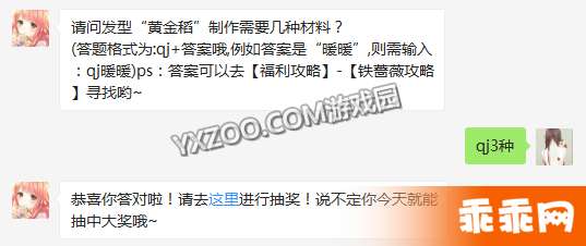 奇迹暖暖2月27日题目:请问发型“黄金稻”制作需要几种材料?