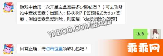 天天爱消除2月27日每日一题题目:游戏中使用一次开星宝盒需要多少颗钻石?(可去攻略站中查找答案)出题人:陈树树?