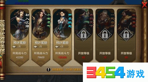 想要获得结识英雄的英雄帖,最主要的活动就是英雄试炼。英雄试炼每天可以参加1次,需要玩家等级达到27级以上可以参加。参与的模式是单人。目前游戏中的英雄试炼副本分为6个难度。需要玩家达到指定的等级才可以挑战。难度分别为初始的初入江湖难度,40级的小有名气,50级的声名鹊起,60级的名扬天下,70级的一代宗师,80级的武林泰斗。每位玩家,每天可以选择一个难度的进行挑战。挑战成功会获得银两,经验,英雄拜帖碎片等奖励。成功通关副本还可以获得完整的英雄拜帖奖励。难度越高,获得的各种奖励也就越好。每次成功通关一个新的难度,还可以激活银两商城中新的购买权限。每个难度的副本,都需要玩家挑战10个BOSS。BOSS都是游戏中一些副本和活动中的BOSS,使用的技能也都是一样的,打法也一样。基本上都比较的简单,需要注意的是副本所需的战斗力。不要挑战和自身战斗力差距过大的副本。BOSS的打法一样,但是BOSS的攻击和防御还是差别很大的。