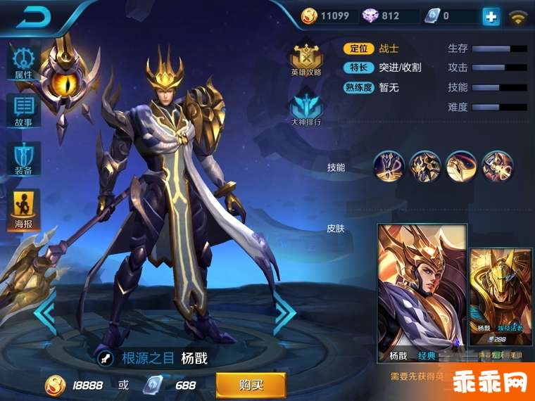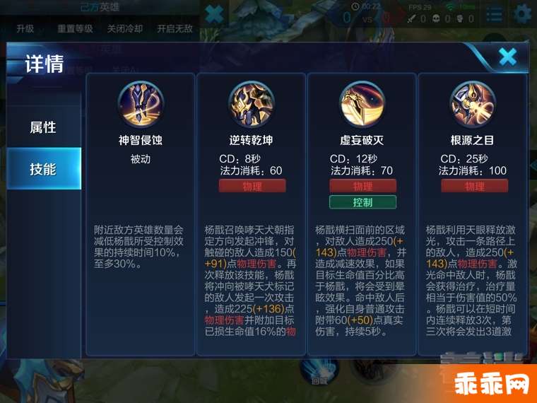 技能简介:杨戬的一技能可以先释放哮天犬冲锋标记对手,标记到之后自己就可以直接突进攻击被标记对手,一击必杀还能够刷新一技能的冷却时间。二技能横扫面前的区域,目标英雄生命值百分比高于杨戬的时候可以眩晕对手。大招是天眼释放激光,攻击一条路径上的敌人,激光命中敌人杨戬会获得治疗,而且在短时间内可以释放三次。