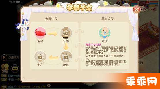 1、夫妻之间,可通过夫妻生子获得孩子,也可以单人求子;但是单身的玩家只能单人求子。