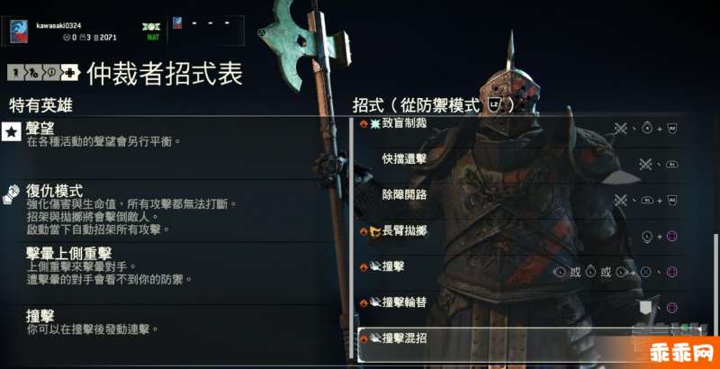 首先你要知道仲裁者尾2的招式,撞击轮替,使用方法是挡格后按“破防”键,这个撞击能够消耗敌人的精力,而且还能接连击,比起招架更加安全地消耗对手的体力,而且还有效对抗佯攻,因为你不会再需要用招架来消耗体力或反击,只用防御也能达到跟招架一样的效果,另外有足够的,反破防能力的话基本上是铜墙铁壁。
