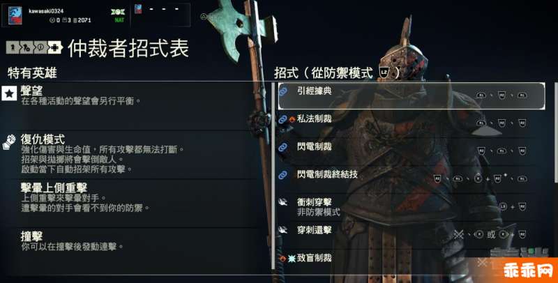 仲裁者属于不停消耗对手的体力然后反击的角色,在正常情况下,仲裁者的攻击速度太慢很容易被人招架,所以你目标就是消耗体力,推倒地后反击,仲裁者的所有上段重击都附带击晕效果但上段攻击比侧重击速度慢很多,能够给敌人一种长期防御上方压力。在撞击后接招就只需要用2次重击,也因为都是重击,所以配合有击晕效果的上段重击跟佯攻骗招来玩弄对手,在进攻跟消耗体力也有不错的效果。