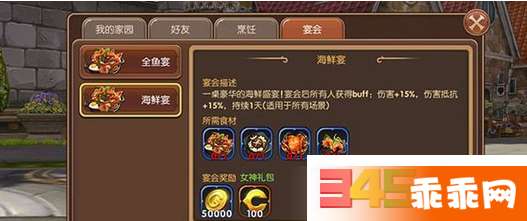 宴会开启后将会和友好度最高的三人一起享受美味佳肴。并且给大家看看宴会的增益BUFF一桌豪华的海鲜盛宴,宴会后所有人获得BUFF,伤害 15%,伤害抵抗 15%,buff适用于任何场景,持续一天。