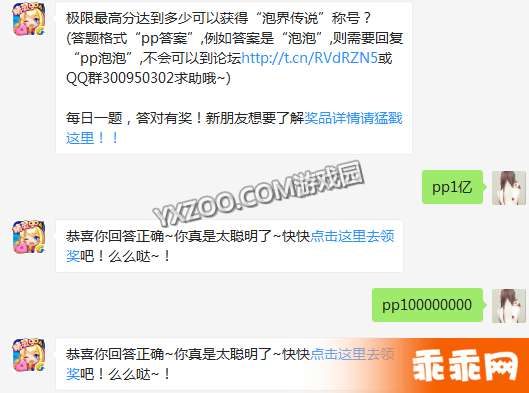 题目:极限最高分达到多少可以获得“泡界传说”称号? (答题格式为:pp+答案哦,例如答案是“泡泡”,则需输入:pp泡 泡,么么哒们, 把正确答案告诉糖小萌就可以去领奖哟~)今天的全民泡泡大战每日一题答案是什么 呢,继续为大家送上今天的微信每日一题活动答案,希望对玩 家获得抽奖有帮助!