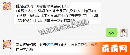 题目:酷跑游戏内,邮箱的邮件保存几天?(答题格式:kp+选项,例如答案是开心,则输入:kp开心)天天酷跑每日一题答 案现在 来就揭晓,喜欢酷跑的朋友千万别错过今天的天天酷跑微信抽奖哦!