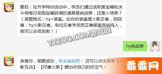 题目:在开学特训活动中,学员们通过活跃度宝箱和决斗场每日奖励宝箱获得的道具是挑战券,还是入场券?(答题格式:hy+答案。如你的答案是火影忍者,则回复:hy火影忍者。各位忍者学员把正确答案告诉鸣人,就可以去领奖啦!)