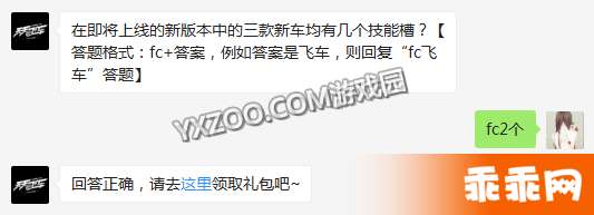 题目:在即将上线的新版本中的三款新车均有几个技能槽?【答题格式:fc+答案,例如答案是飞车,则回复“fc 飞车”答题】天天飞车2月28每日一题答案来啦,幸运魔法球中,幸运奖励可以多 次获得吗?(回 答“是” 或“否”)