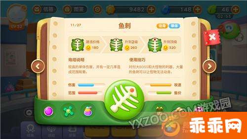 鱼刺是一款单体攻击炮塔,除了输出较高,它还有一定几率造成范围眩晕。它的初始造价是180金币,升到2级需260金币,顶级则是320金币。价格不高,但效果却不会因此而打折,大量的鱼刺可以让怪物无法动身,只能乖乖的等待死亡的降临。