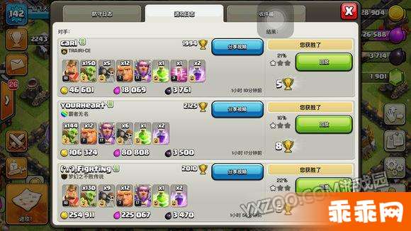 造兵和法术的高效率安排 想开加速的教徒可以仔细看看:对于满兵营的情况下可以预存一波兵 先点满160哥布林 之后再点12胖子 这时候训练营是460个单位剩余20位置不去理他 为什么这样造?因为出去的时候可能遇到死鱼几十个哥布林就吃掉了之后回营 如果是先造的胖子 这时候就会补充胖子 让配兵比例失调从而要去捐兵或者扔掉才能调回12胖子的比例 也有可能打完一波用完了胖子和哥布林但是一个炸弹人也没用 这时候补上事先造好的160哥布林和12胖子正好满营 缺了多少个炸弹再来补充就好了 就是造兵必须预备160哥布林在前排12巨人在后排。法术只造两单位的跳墙和狂暴 小药水一个都不造因为会打乱循环造药水的节奏 也就是出门只带10个单位的药水 有12个单位的药水是预存着的 也就是可以提前预存6个药水 一般情况下都是只用到两个狂暴一个跳墙的 有些疑难阵型才会用到两跳墙 至于三狂暴两跳墙都用到的属于一些特别难攻略的阵了 法术的预存排位顺序就是两狂暴两跳墙两狂暴 这样当你用掉两狂暴一跳墙的情况下 它会补上这三个药水 剩下的就是一跳墙在最前面两狂暴在后面 这样的时候就需要再造一个跳墙然后再点两个狂暴 这样造好了哪怕下一波用掉两跳墙也会及时补上然后剩余两狂暴 接着再预存两跳墙两狂暴就是了 对于想开加速的教徒就要掌握好这一点小技巧避免拖慢节奏