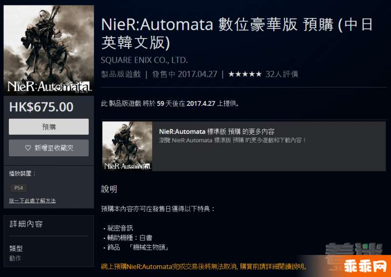 PS4动作游戏《尼尔机械纪元》的港版中文已经于港服PS STORE开启预购,港版普通版售价398港版,带有后续付费dlc等内容的豪华版售价675港币。中文版正式发售时间为2017年4月27日。