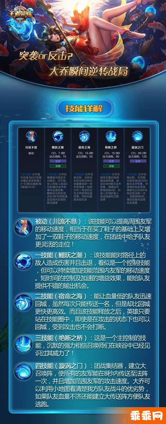 对于王者荣耀的玩家来说,新英雄大乔的上线意义非凡,一方面她是王者荣耀中第一个拥有四个技能的英雄,另一方面就是她的技能都不错。尤其是在辅助方面非常强力。为了让大家更加了解这个英雄的看法,下面我们从一张图来了解一下这个英雄的攻略吧!
