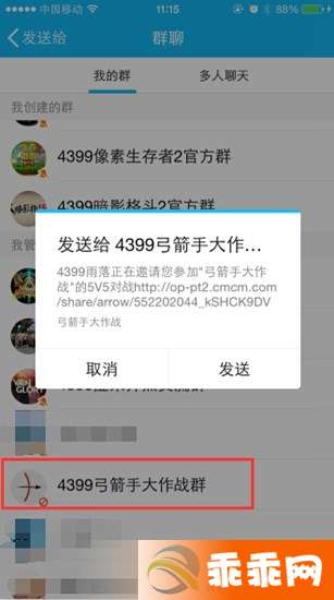比如小编就是直接发送在“4399弓箭手大作战开黑群”里面的,所以在群中就能看到小编的推送,群里的其他玩家们只需要点击这个推送,就可以加入小编的队伍了。