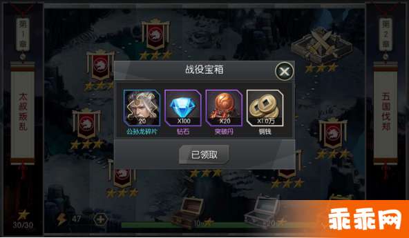 除此之外,剧情副本还能收集通关星数领取战役宝箱,每一章副本集齐30个通关星数,就可以领取战役宝箱,在战役宝箱中有大量钻石、招募令、武将碎片、武将培养材料。