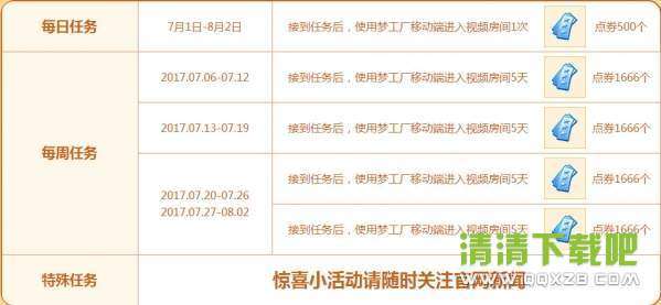 接受任务,在梦工厂视频房间内累计停留1分钟即可不同时间获得点券不同