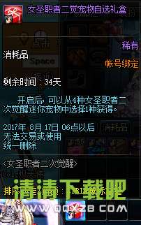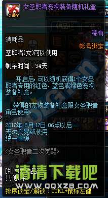 开启后,可以随机获得1个女圣职者专用的红色、蓝色或绿色宠物装备礼盒。