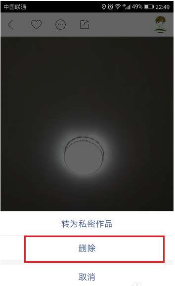 第三步在弹出框界面,点击删除,也可以选择转为私密作品,只能自己观看,如下图所示: