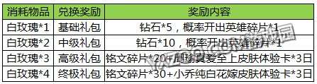 十里春风不如你,白色情人节一起开黑吧!与以下羁绊英雄之一一起排位胜利*1(自己使用或者队友使用均可),每完成一个条件均可获得白玫瑰*1+铭文碎片*20,收集兑换限定情侣皮肤体验卡!
