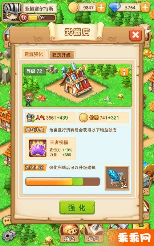 营收类的建筑,杂货铺、武器店、战士训练场等,它们有两种属性——魅力与价格。魅力值的高低决定了它的吸客程度,价格值代表每个顾客光顾后获得的金币收益。其中训练场建筑还能帮助勇者提升能力!魅力值和价格并不是永久不变的,就像往图书馆建筑中投入“羊皮纸”道具会大幅提升图书馆的魅力值和价格,当提高到max时,建筑就会升级。能否找到合适的道具,培养相应的建筑也是件有趣的事情。