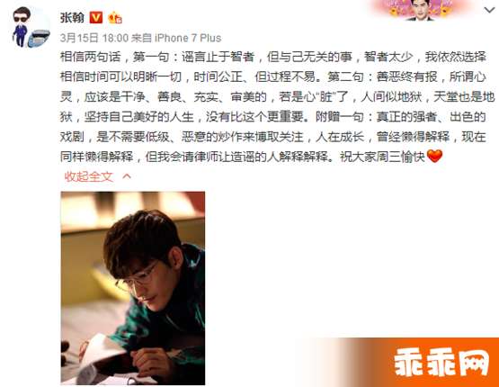 稍后,张翰工作室转发微博并霸气写道:“让心更干净,让真相更清晰,让网络更简单一点,让真实的声音传播有力!你有谣言,我有武器。”